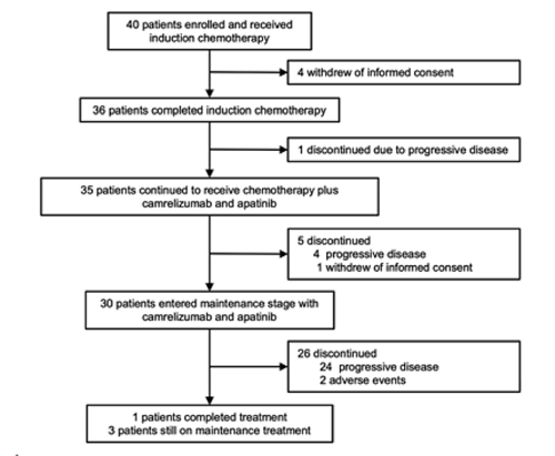 本研究首次探索了“诱导化疗后+卡瑞利珠单抗+阿帕替尼+化疗”四联方案在ES-SCLC中的疗效与安全性。