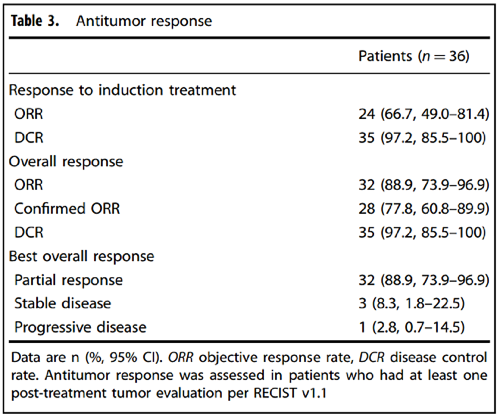 在36例可评估的患者中,总体ORR为88.9%(95% CI:73.9%-96.9%),其中32例(88.9%)患者部分缓解(PR),3例(8.3%)患者病情稳定(SD)(表2)。DCR为97.2%(95% CI:85.5%-100%)。中位PFS为7.3个月(95% CI:6.6-9.2)。中位OS为17.3个月(95% CI:11.8-未达到)。12个月OS率为63.4%(95% CI:45.4%-76.9%)(图2)。